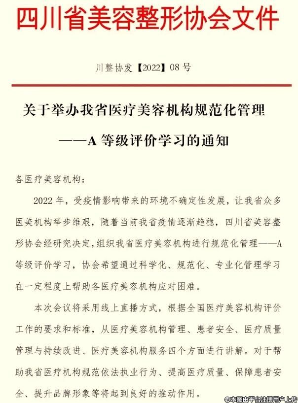 四川省美容整形協(xié)會經(jīng)研究決定,組織我省醫(yī)療美容機(jī)構(gòu)進(jìn)行規(guī)范化管理——A等級評價學(xué)習(xí),協(xié)會希望通過科學(xué)化、規(guī)范化、專業(yè)化管理學(xué)習(xí)在一定程度上幫助各醫(yī)療美容機(jī)構(gòu)應(yīng)對困難。
