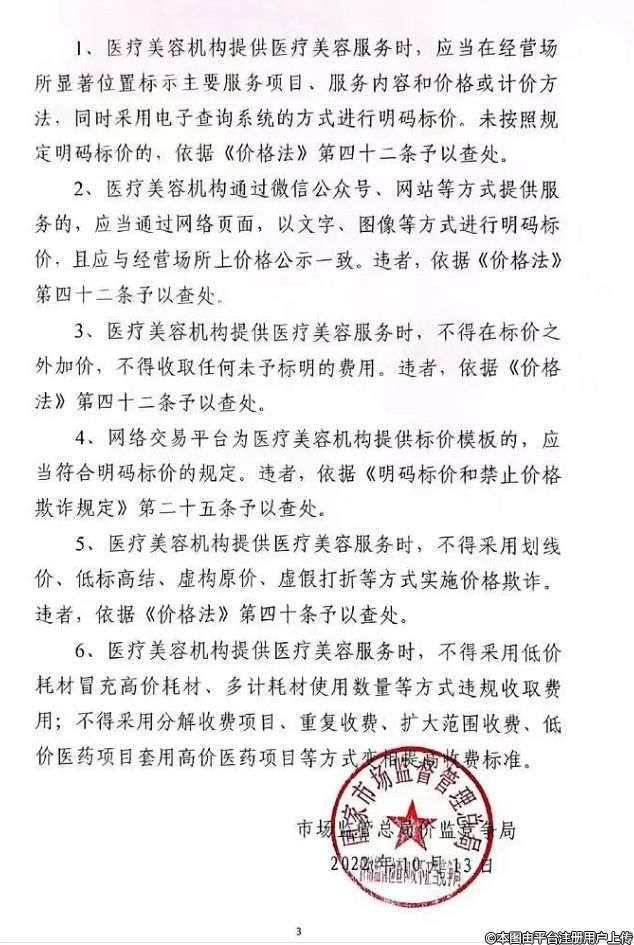 4、網(wǎng)絡(luò)交易平臺(tái)為醫(yī)療美容提供標(biāo)價(jià)模板的,應(yīng)當(dāng)符合明碼標(biāo)價(jià)的規(guī)范。違者,依據(jù)《明碼標(biāo)價(jià)和禁止價(jià)格欺詐規(guī)定》第二十條予以查處。