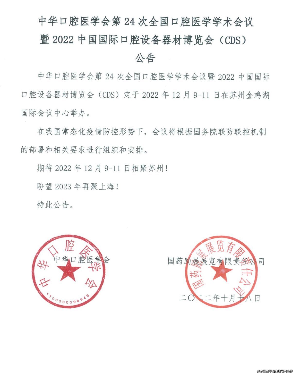 中華口腔醫(yī)學(xué)會(huì)第24次全國口腔醫(yī)學(xué)學(xué)術(shù)會(huì)議暨2022中國國際口腔設(shè)備器材博覽會(huì) "(CDS)公告