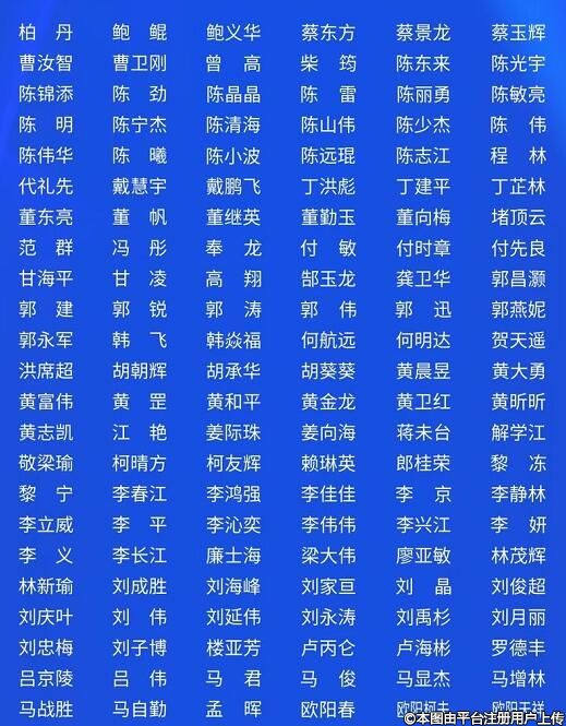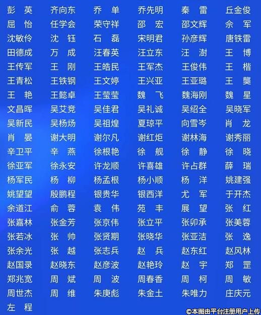 曹衛(wèi)剛、曾高、陳東來、陳光宇、陳繼革、陳敏亮、陳偉華、丁芷林、董帆、堵頂云、黃和平、黃金井、霍然、姜南、郎桂榮、黎凍、黎青山、李洪生、李健寧、李京、劉成勝、劉偉、盧忠、呂京陵、馬顯杰、歐陽天祥、亓發(fā)芝、齊向東、邵宏、邵文輝、孫中生、瓦慶彪、文昌暉、吳溯帆、吳曉軍、吳新民、肖志波、辛衛(wèi)平、徐根艷、許龍順、展望、張斌、張若冰、張亞潔、張余光、朱金土