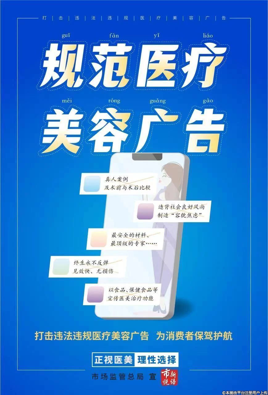 昨日,市場監(jiān)管總局在其微信公眾號發(fā)布圖片信息:“規(guī)范醫(yī)療美容廣告,打擊違規(guī)違法醫(yī)療美容廣告,為消費(fèi)者保駕護(hù)航”。