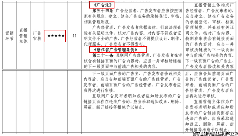 內(nèi)容概括:第11點(diǎn)主要介紹廣告審核的相關(guān)情況,根據(jù)《廣告法》《浙江省廣告管理?xiàng)l例》的相關(guān)條例,直播營銷主體應(yīng)該嚴(yán)格按照要求發(fā)布相關(guān)內(nèi)容,針對互聯(lián)網(wǎng)一級頁面、二級頁面全部審核,如果發(fā)現(xiàn)明顯違規(guī)行為應(yīng)該當(dāng)采取通知改正、刪除、屏蔽、斷開鏈接等措施予以制止。