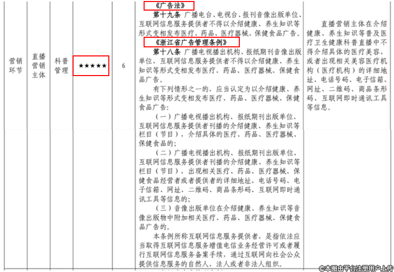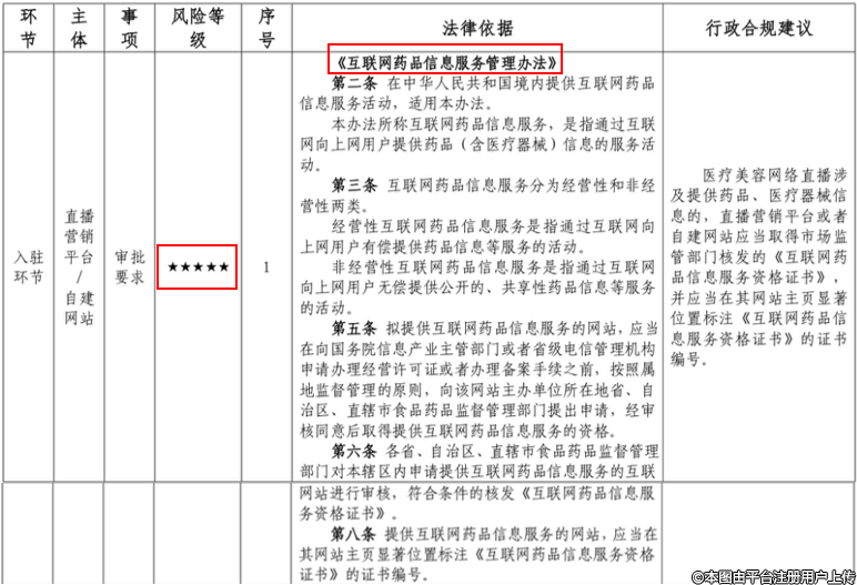 內(nèi)容概括:第1條主要表述,醫(yī)美機(jī)構(gòu)如果做直播涉及到藥品、醫(yī)療器械信息,無論自建平臺還是入駐平臺,首先需要取得市場監(jiān)管部門的《互聯(lián)網(wǎng)藥品信息服務(wù)資格證書》后并在顯著部位標(biāo)準(zhǔn)證書編號方便消費(fèi)者查看。