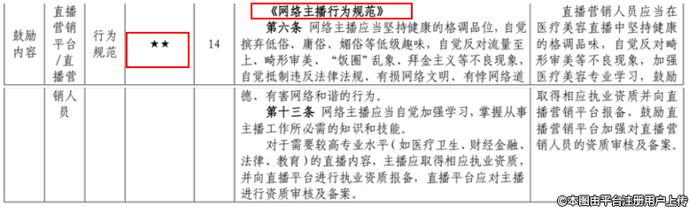 內(nèi)容概括:第14點(diǎn)主要強(qiáng)調(diào)加強(qiáng)主播的行為規(guī)范,針對較高專業(yè)水平(如醫(yī)療衛(wèi)生、財(cái)經(jīng)金融、法律、教育)的直播內(nèi)容,主播應(yīng)取得相應(yīng)執(zhí)業(yè)資質(zhì),鼓勵直播營銷平臺加強(qiáng)對直播營銷人員的資質(zhì)審核及備案。