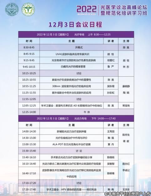 學(xué)習(xí)班將邀請(qǐng)國(guó)內(nèi)光醫(yī)學(xué)領(lǐng)域頂級(jí)專(zhuān)家講授光醫(yī)學(xué)診治醫(yī)學(xué)理論及進(jìn)展,包括多種光醫(yī)學(xué)治療方法在皮膚科的應(yīng)用(NB-UVB、308nmUVB、光動(dòng)力療法、淺層X(jué)線、UVA1等)、多種疾病的光醫(yī)學(xué)治療進(jìn)展(銀屑病、難治性白癜風(fēng)、痤瘡、玫瑰痤瘡、血管性疾病、特應(yīng)性皮炎、光老化、皮膚腫瘤等)、家庭光療在皮膚疾病治療中的重要性、光動(dòng)力治療尖銳濕疣的應(yīng)用技巧、難治性白癜風(fēng)的個(gè)體化光療、紫外線聯(lián)合中藥外治在皮膚科的應(yīng)用等。本次學(xué)習(xí)班特開(kāi)設(shè)銀屑病專(zhuān)場(chǎng),邀請(qǐng)國(guó)內(nèi)銀屑病領(lǐng)域大咖,深入講解銀屑病科研及治療的前沿進(jìn)展。