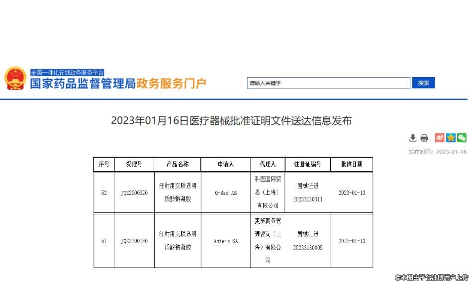 1月16日消息,Q-Med AB(以下簡(jiǎn)稱(chēng)“Q-med”,代理人:科醫(yī)國(guó)際貿(mào)易(上海)有限公司)的“注射用交聯(lián)透明質(zhì)酸鈉凝膠”及Anteis SA(以下簡(jiǎn)稱(chēng)“Anteis”,代理人:麥?zhǔn)┥虅?wù)管理咨詢(xún)(上海)有限公司)的“注射用交聯(lián)透明質(zhì)酸鈉凝膠”正式獲得NMPA批準(zhǔn),獲準(zhǔn)上市。
