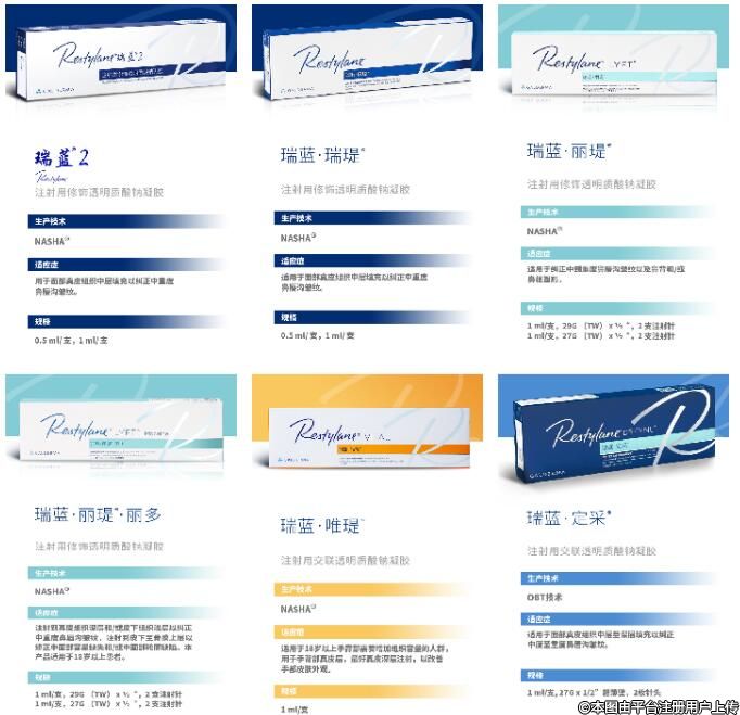 ▲此前已獲NMPA批準(zhǔn)上市的6款Restylane系列產(chǎn)品(淺色為NASHA系列玻尿酸,深色為OBT系列玻尿酸,圖源:Restylane官網(wǎng))