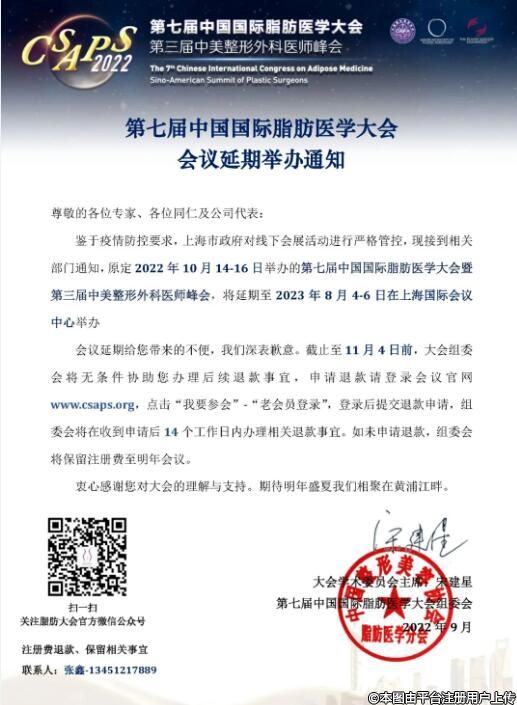會議延期舉辦通知 第七屆中國國際脂肪醫(yī)學大會