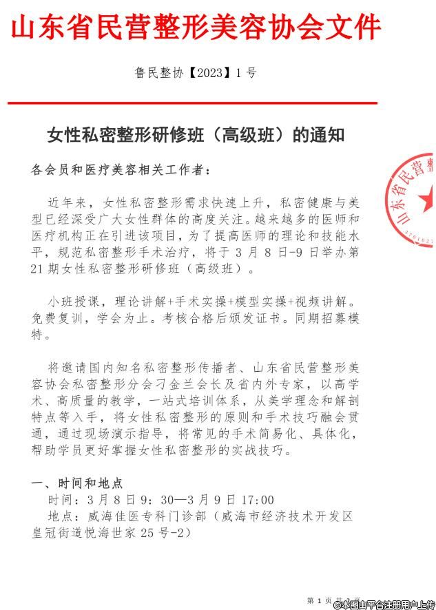 第21期女性私密整形研修班(高級班)將于3月8日-9日在威海舉辦,小班授課,理論講解+手術實操+模型實操+視頻講解。免費復訓,學會為止。考核合格后頒發(fā)證書。同期招募模特。