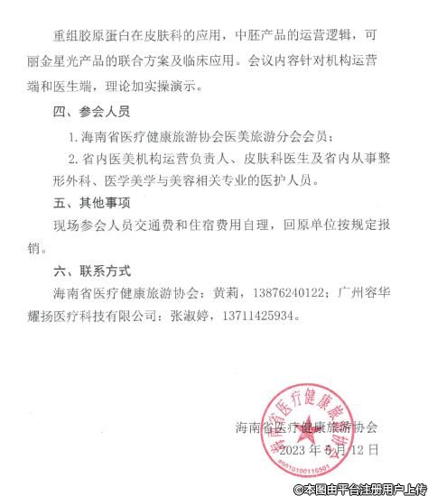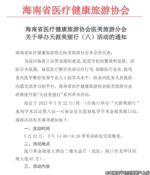 擬定于 2023 年5月22日(周一)在海口舉辦“天涯美麗行系列學(xué)術(shù)活動(dòng)第八站一可麗金星光膠原私享學(xué)術(shù)會(huì)海南??谡荆F(xiàn)將活動(dòng)有關(guān)事項(xiàng)通知如下: