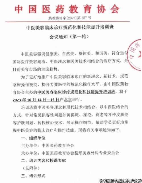 為了更好地推廣中醫(yī)美容臨床診療的新理念、新技術(shù),規(guī)范臨床操作技能,提升專業(yè)醫(yī)生的規(guī)范化操作水平,由中國醫(yī)藥教育協(xié)會主辦的中醫(yī)美容臨床診療規(guī)范化和技能提升培訓(xùn)班,將于2023年10月14日—15日在北京舉行。