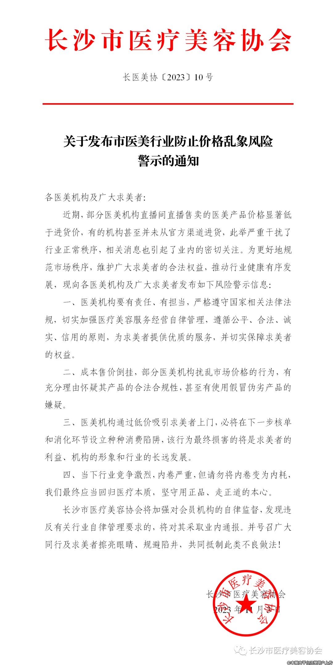 長沙市醫(yī)療美容協(xié)會(huì)微信公眾號(hào)11月3日發(fā)布《關(guān)于發(fā)布市醫(yī)美行業(yè)防止價(jià)格亂象風(fēng)險(xiǎn)警示的通知》:
