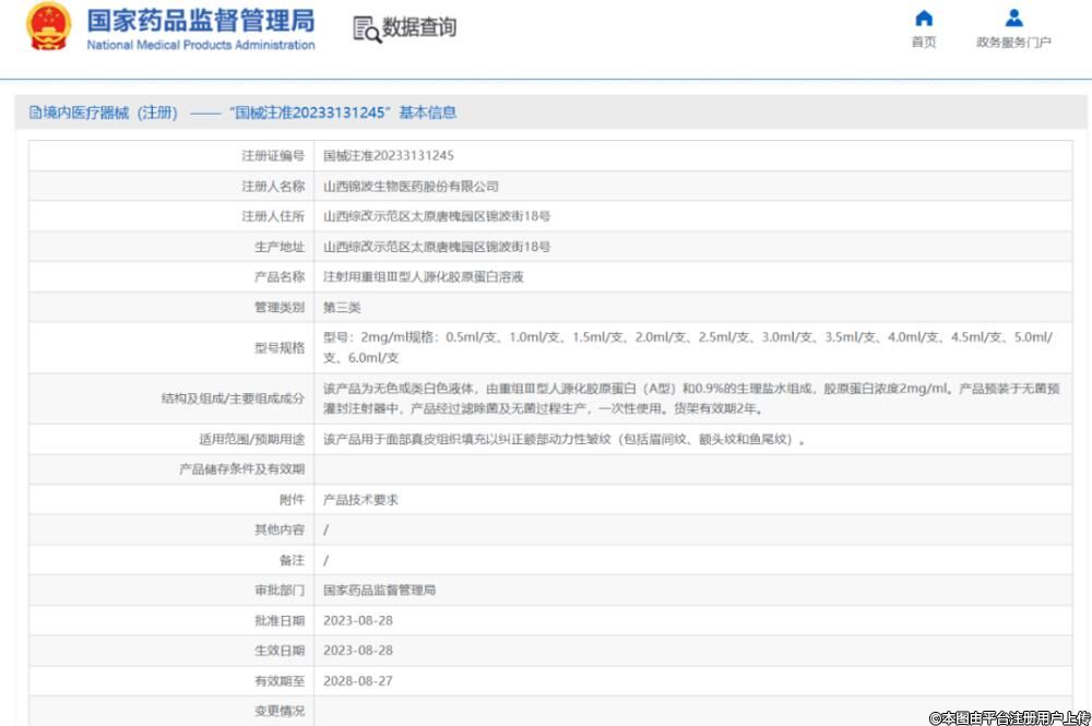 這是一款與山西錦波生物合作的械III類注射膠原蛋白,注射證號(hào)為:國械注準(zhǔn)20233131245。