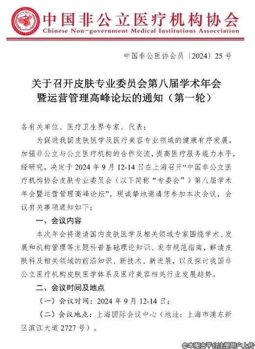 為更好地促進(jìn)我國(guó)皮膚醫(yī)學(xué)及醫(yī)療美容專業(yè)領(lǐng)域的健康有序發(fā)展,加強(qiáng)非公立與公立醫(yī)療機(jī)構(gòu)的合作交流,提高醫(yī)療服務(wù)能力水平,經(jīng)研究,決定于2024年9月12-14日在上海舉行“中國(guó)非公立醫(yī)療機(jī)構(gòu)協(xié)會(huì)皮膚專業(yè)委員會(huì)(以下簡(jiǎn)稱“專委會(huì)”)第八屆學(xué)術(shù)年會(huì)暨運(yùn)營(yíng)管理高峰論壇”?,F(xiàn)誠(chéng)摯地邀請(qǐng)您參加本次會(huì)議,為提高我國(guó)皮膚科醫(yī)療水平貢獻(xiàn)力量。