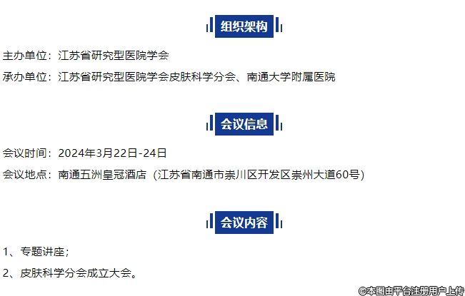 為全面提升江蘇省各級醫(yī)院皮膚科學(xué)專業(yè)醫(yī)療技術(shù)水平和服務(wù)質(zhì)量,健全江蘇省皮膚科醫(yī)師隊伍的建設(shè)和管理追蹤皮膚科學(xué)領(lǐng)域新進展,擬于2024年3月22日-24日在南通五洲皇冠酒店召開“皮膚科學(xué)分會第一屆年會暨皮膚科學(xué)分會成立大會”。本次會議將邀請全國皮膚科學(xué)領(lǐng)域的著名專家授課并召開皮膚科學(xué)分會成立大會參會人員200人。歡迎皮膚科醫(yī)師參會。