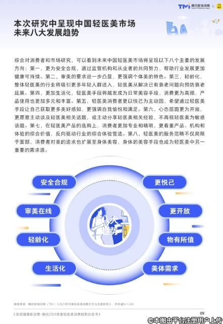 中國(guó)輕醫(yī)美未來(lái)發(fā)展八大發(fā)展趨勢(shì)包括:安全合規(guī)、審美在線、輕齡化、生活化、更悅己、更開(kāi)放、物有所值、美體需求。