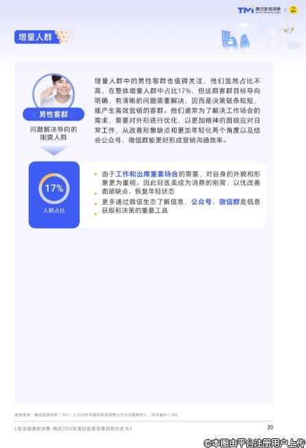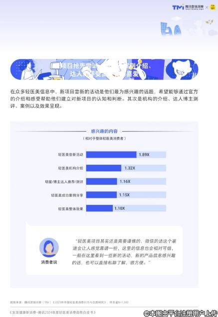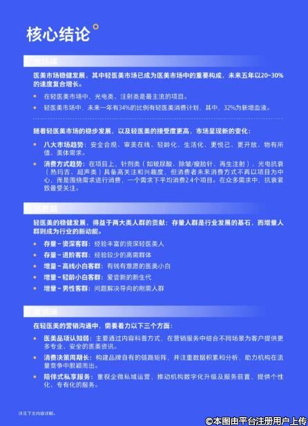 安全合規(guī)指求美者要驗(yàn)證機(jī)構(gòu)的背景、人員的資質(zhì)、產(chǎn)品的真?zhèn)蔚?。審美在線指求美者從于篇一律朝著自然個(gè)性轉(zhuǎn)變。輕齡化指求美者里年輕人比例增大,在全球也首屈一指。生活化指求美者會(huì)把更多舒適且有效的治療當(dāng)作更美好的生活方式。更悅己指求美者的需求驅(qū)動(dòng)力開(kāi)始來(lái)源于自我認(rèn)可和自我追求。更開(kāi)放是求美者不再忌諱醫(yī)美,愿意分享醫(yī)美。物有所值指求美者不是只看價(jià)格,而是要看價(jià)值,價(jià)值匹配價(jià)格的項(xiàng)目才能打動(dòng)他們。美體需求是求美者從面部美容到身體健康在延生,其中孕育著極大的新市場(chǎng)。