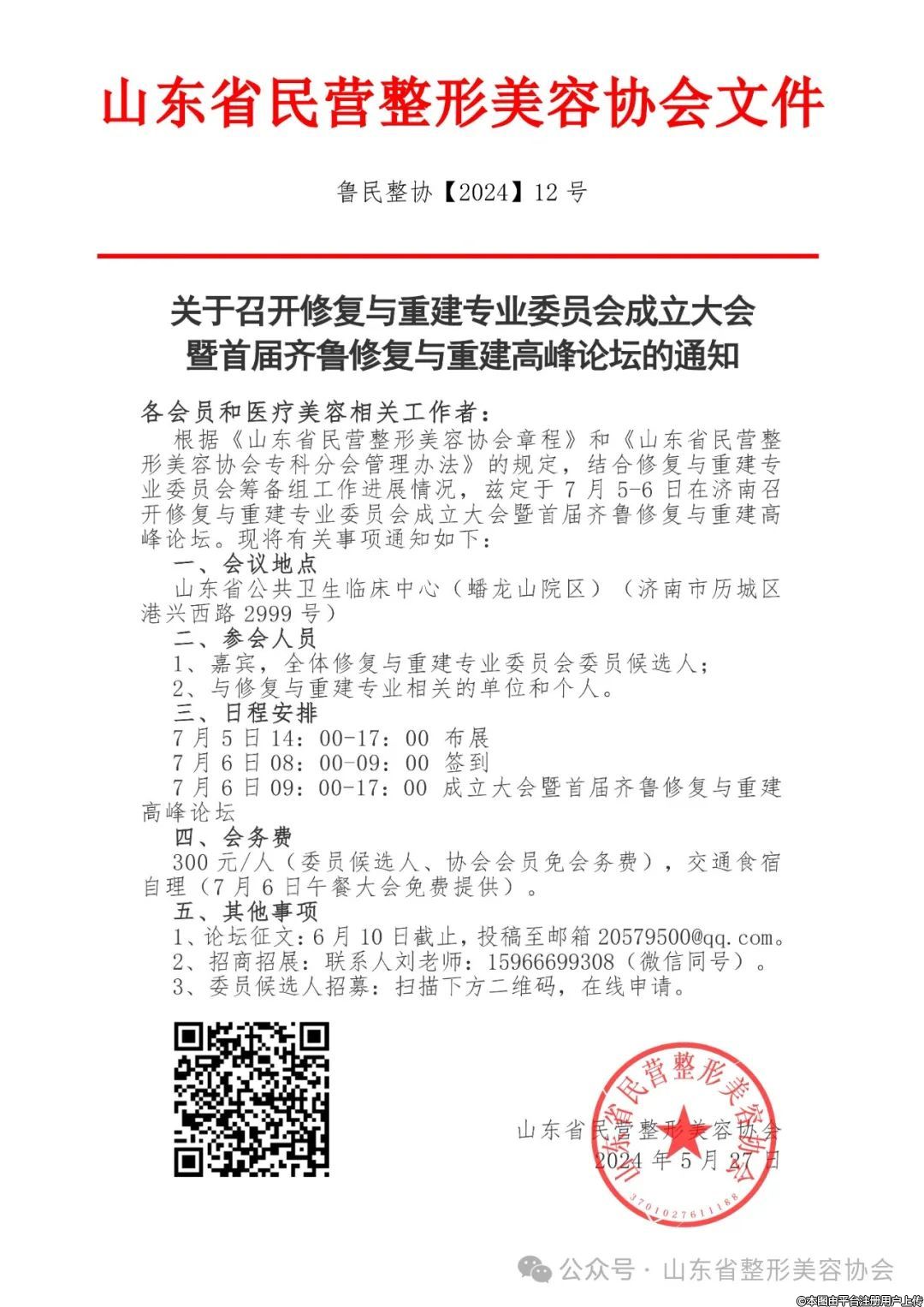 根據(jù)《山東省民營整形美容協(xié)會章程》和《山東省民營整形美容協(xié)會專科分會管理辦法》的規(guī)定,結(jié)合修復(fù)與重建專業(yè)委員會籌備組工作進(jìn)展情況,茲定于7月5-6日在濟(jì)南召開修復(fù)與重建專業(yè)委員會成立大會暨首屆齊魯修復(fù)與重建高峰論壇?,F(xiàn)將有關(guān)事項通知如下: