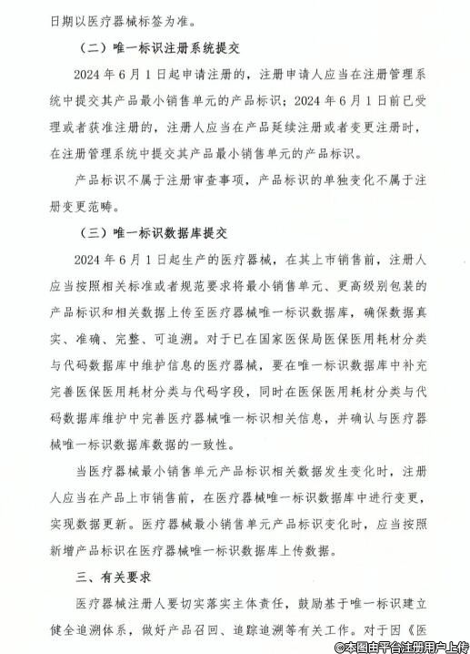 2024年6月1日起生產(chǎn)的醫(yī)療器械,在其上市銷售前,注冊(cè)人應(yīng)當(dāng)按照相關(guān)標(biāo)準(zhǔn)或者規(guī)范要求將最小銷售單元、更高級(jí)別包裝的產(chǎn)品標(biāo)識(shí)和相關(guān)數(shù)據(jù)上傳至醫(yī)療器械唯一標(biāo)識(shí)數(shù)據(jù)庫,確保數(shù)據(jù)真實(shí)、準(zhǔn)傭元整中住國家醫(yī)休間醫(yī)休醫(yī)用老材與代碼數(shù)據(jù)庫中維護(hù)信息的醫(yī)療器械,要在唯一標(biāo)識(shí)數(shù)據(jù)庫中補(bǔ)充完善醫(yī)保醫(yī)用耗材分類與代碼字段,同時(shí)在醫(yī)保醫(yī)用耗材分類與代碼數(shù)據(jù)庫維護(hù)中完善醫(yī)療器械唯一標(biāo)識(shí)相關(guān)信息,并確認(rèn)與醫(yī)療器械唯一標(biāo)識(shí)數(shù)據(jù)庫數(shù)據(jù)的一致性。