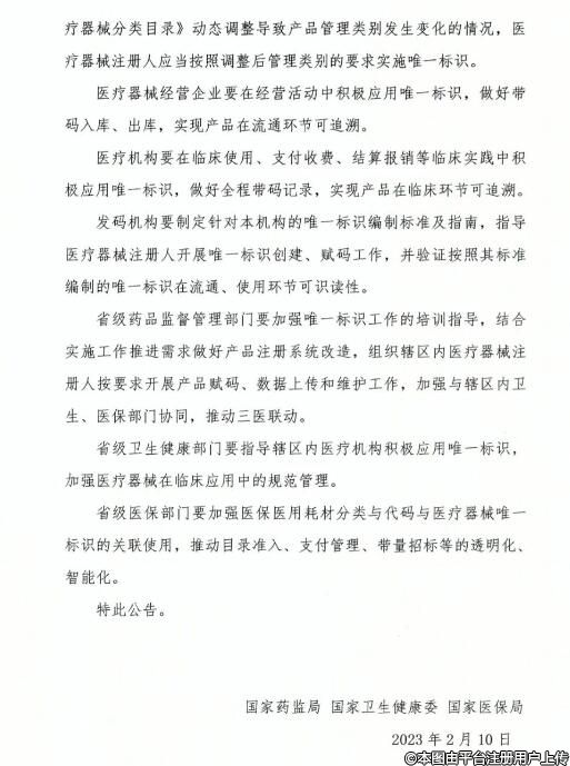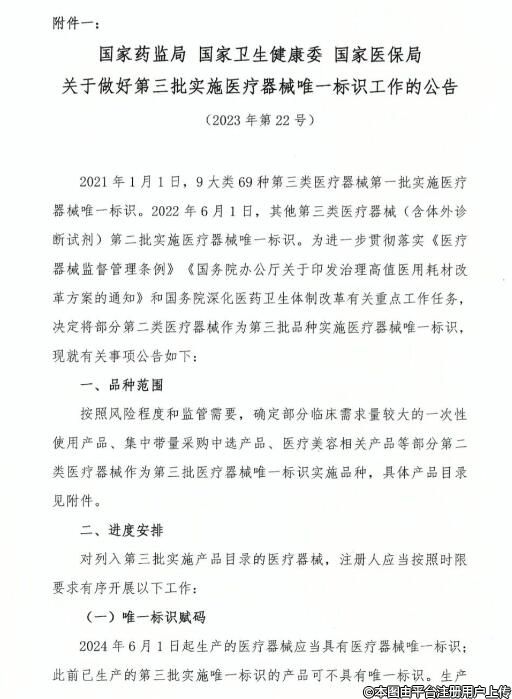 2021年1月1日,9大類69種第三類醫(yī)療器第一批實(shí)施醫(yī)療器械唯一標(biāo)識(shí)。2022年6月1日,其他第三類醫(yī)療器械(含體外診斷試劑)第二批實(shí)施醫(yī)療器械唯一標(biāo)識(shí)。為進(jìn)一步貫徹落實(shí)《醫(yī)療器械監(jiān)督管理?xiàng)l例》《國務(wù)院辦公廳關(guān)于印發(fā)治理高值醫(yī)用耗材改革方案的通知》和國務(wù)院深化醫(yī)藥衛(wèi)生體制改革有關(guān)重點(diǎn)工作任務(wù)決定將部分第二類醫(yī)療器械作為第三批品種實(shí)施醫(yī)療器械唯一標(biāo)識(shí)現(xiàn)就有關(guān)事項(xiàng)公告如下: