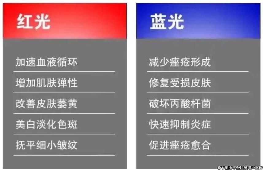 紅藍光能夠抑制炎癥反應,滲透至真皮層,加快細胞代謝,促進膠原蛋白生成,有助于改善紅色痘印。