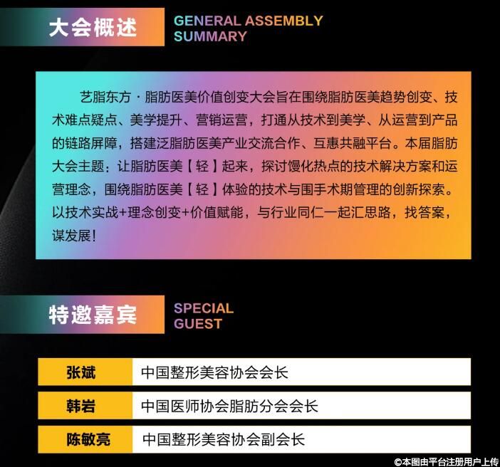 藝脂東方·脂肪醫(yī)美價值創(chuàng)變大會旨在圍繞脂肪醫(yī)美趨勢創(chuàng)變、技術(shù)難點疑點、美學提升、營銷運營,打通從技術(shù)到美學、從運營到產(chǎn)品的鏈路屏障,搭建泛脂肪醫(yī)美產(chǎn)業(yè)交流合作、互惠共融平臺。本屆脂肪大會主題:讓脂肪醫(yī)美【輕】起來,探討?zhàn)z化熱點的技術(shù)解決方案和運營理念,圍繞脂肪醫(yī)美【輕】體驗的技術(shù)與圍手術(shù)期管理的創(chuàng)新探索。以技術(shù)實戰(zhàn)+理念創(chuàng)變+價值賦能,與行業(yè)同仁一起匯思路,找答案謀發(fā)展!