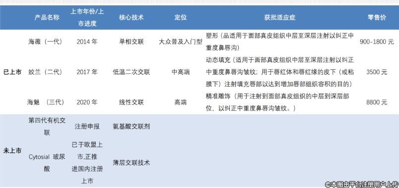 其中,海薇定位于大眾普及入門型HA 填充劑,為醫(yī)美機(jī)構(gòu)的引流產(chǎn)品;姣蘭新增唇部適應(yīng)癥推廣,帶來新的增長(zhǎng)空間;海魅定位高端市場(chǎng),主打無顆粒線性交聯(lián)技術(shù),產(chǎn)品質(zhì)地較優(yōu)+外輪廓營(yíng)銷推廣+渠道開拓下延續(xù)高增長(zhǎng)趨勢(shì),產(chǎn)品進(jìn)入快速放量階段。