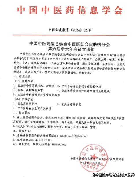 中國中醫(yī)藥信息學(xué)會中西醫(yī)結(jié)合皮膚病分會主辦的第六屆全國學(xué)術(shù)年會定于2024年9月6日—9月8日在沈陽召開。
