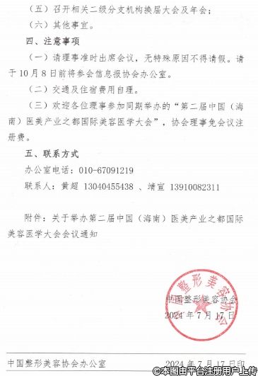根據(jù)協(xié)會章程及年度工作安排,經(jīng)研究決定于10月26日召開中國整形美容協(xié)會2024年理事大會(同期舉辦第二屆中國(海南)醫(yī)美產(chǎn)業(yè)之都國際美容醫(yī)學大會)。