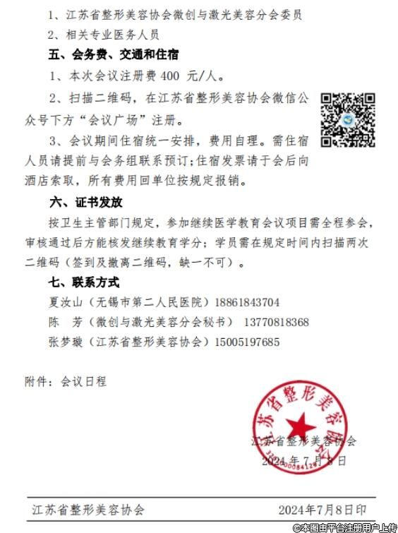 為發(fā)揮江蘇省整形美容協(xié)會(huì)微創(chuàng)與激光美容分會(huì)的引領(lǐng)作用,推動(dòng)我省醫(yī)療美容皮膚與激光美容事業(yè)的發(fā)展,經(jīng)協(xié)會(huì)研究,由江蘇省整形美容協(xié)會(huì)主辦、無(wú)錫市第二人民醫(yī)院承辦的 2024年學(xué)術(shù)年會(huì)暨省級(jí)繼教項(xiàng)目(項(xiàng)目編號(hào):20240712000005)定于2024年7月27-28日在無(wú)錫召開(kāi)。現(xiàn)將會(huì)議有關(guān)事宜通知如下: