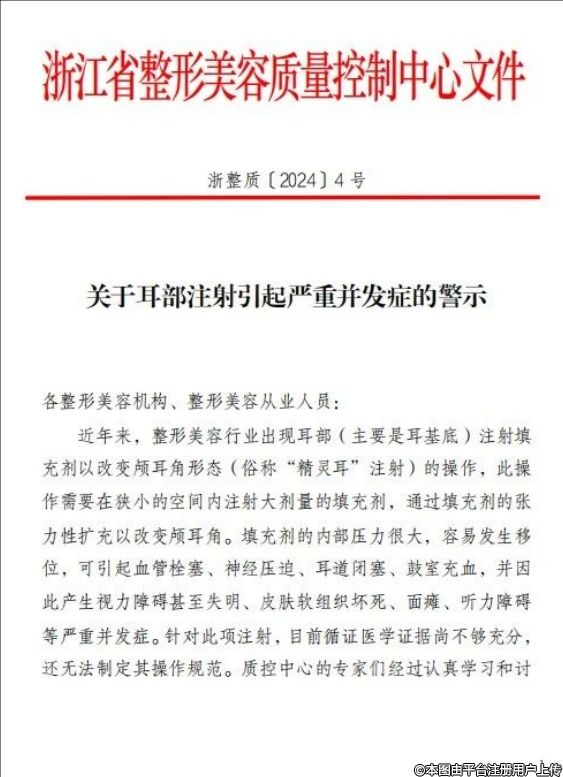 近期,我們注意到整形美容行業(yè)中出現(xiàn)了一種新的操作趨勢(shì),即通過(guò)在耳部(尤其是耳基底區(qū)域)注射填充劑來(lái)改變顱耳角的形態(tài),俗稱“精靈耳”注射。雖然這一操作旨在滿足部分消費(fèi)者對(duì)于特定耳部形態(tài)的追求,但其潛在的風(fēng)險(xiǎn)和并發(fā)癥不容忽視。請(qǐng)各位醫(yī)療美容從業(yè)人員務(wù)必高度重視以下文件浙整質(zhì)[2024]4號(hào),切實(shí)履行好自身的職責(zé)和義務(wù),保障患者的安全和健康。