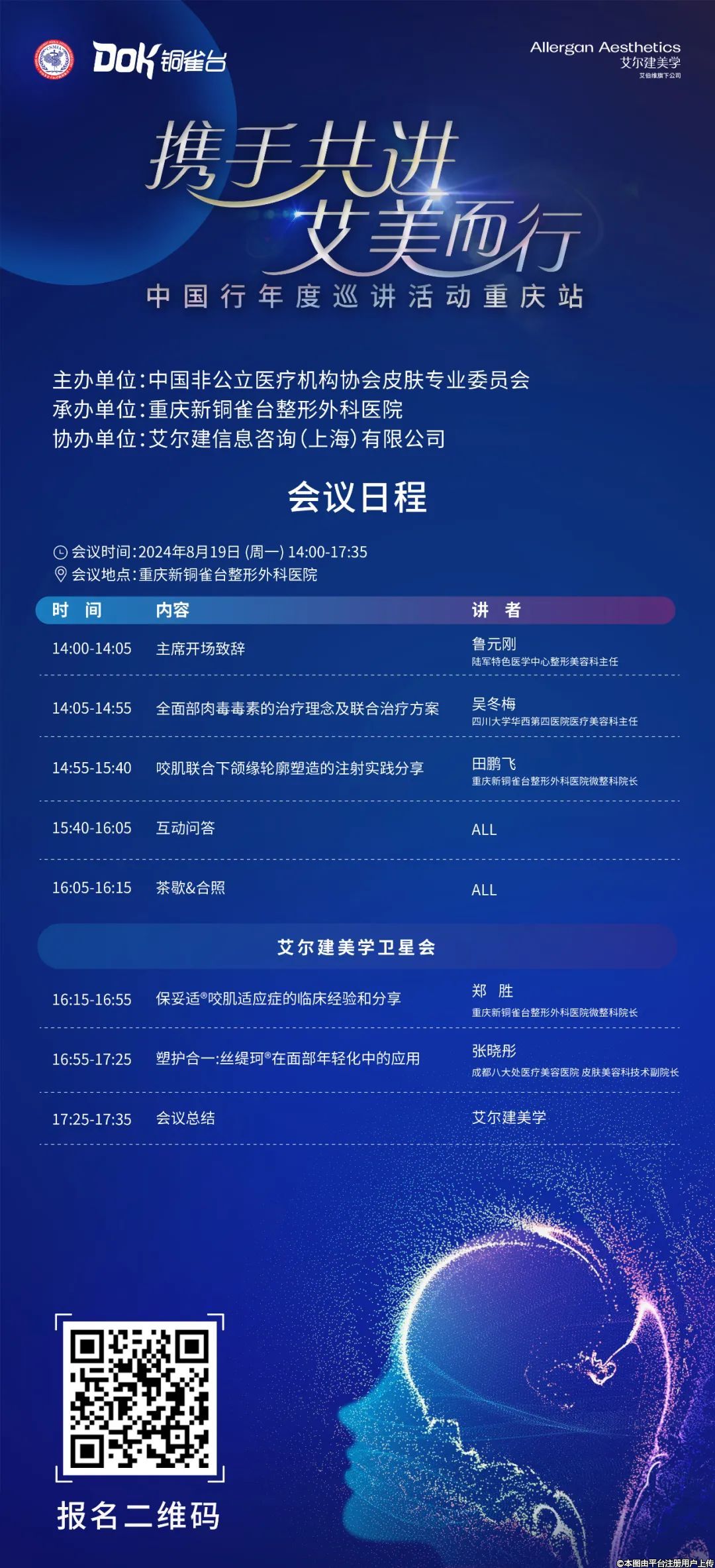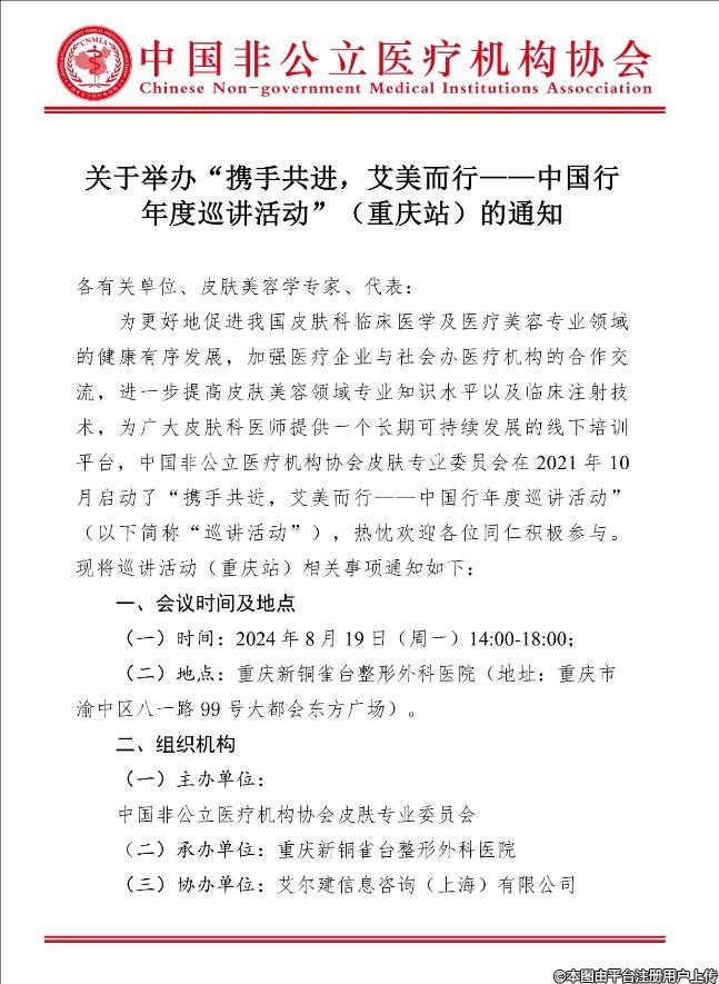 為更好地促進(jìn)我國(guó)皮膚科臨床醫(yī)學(xué)及醫(yī)療美容專業(yè)領(lǐng)域的健康有序發(fā)展,加強(qiáng)醫(yī)療企業(yè)與社會(huì)辦醫(yī)療機(jī)構(gòu)的合作交流,進(jìn)一步提高皮膚美容領(lǐng)域?qū)I(yè)知識(shí)水平以及臨床注射技術(shù),為廣大皮膚科醫(yī)師提供一個(gè)長(zhǎng)期可持續(xù)發(fā)展的線下培訓(xùn)平臺(tái),中國(guó)非公立醫(yī)療機(jī)構(gòu)協(xié)會(huì)皮膚專業(yè)委員會(huì)在2021年10月啟動(dòng)了“攜手共進(jìn),艾美而行——中國(guó)行年度巡講活動(dòng)”(以下簡(jiǎn)稱“巡講活動(dòng)”),熱忱歡迎各位同仁積極參與?,F(xiàn)將巡講活動(dòng)(重慶站)相關(guān)事項(xiàng)通知如下: