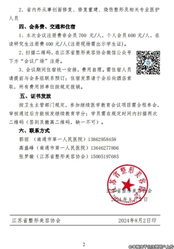 由江蘇省整形美容協(xié)會主辦、江蘇省整形美容協(xié)會修復(fù)與重建整形專業(yè)分會及南通市第一人民醫(yī)院承辦的江蘇省整形美容協(xié)會修復(fù)與重建整形專業(yè)分會2024年學(xué)術(shù)年會(項目編號:20240710403002)定于 2024年9月27-28日在江蘇南通舉辦。屆時將邀請相關(guān)領(lǐng)域知名專家進行專題講座,本次會議采用學(xué)術(shù)交流與課堂講學(xué)相結(jié)合、新技術(shù)與新進展相結(jié)合的方式,內(nèi)容豐富,歡迎廣大醫(yī)務(wù)人員踴躍參加。