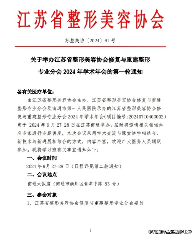 關(guān)于舉辦江蘇省整形美容協(xié)會修復(fù)與重建整形專業(yè)分會2024年學(xué)術(shù)年會的第一輪通知