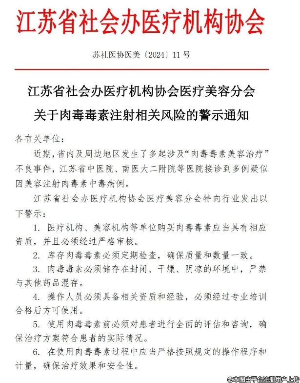 江蘇省社會辦醫(yī)療機構(gòu)協(xié)會醫(yī)療美容分會關(guān)于肉毒毒素注射相關(guān)風(fēng)險的警示通知