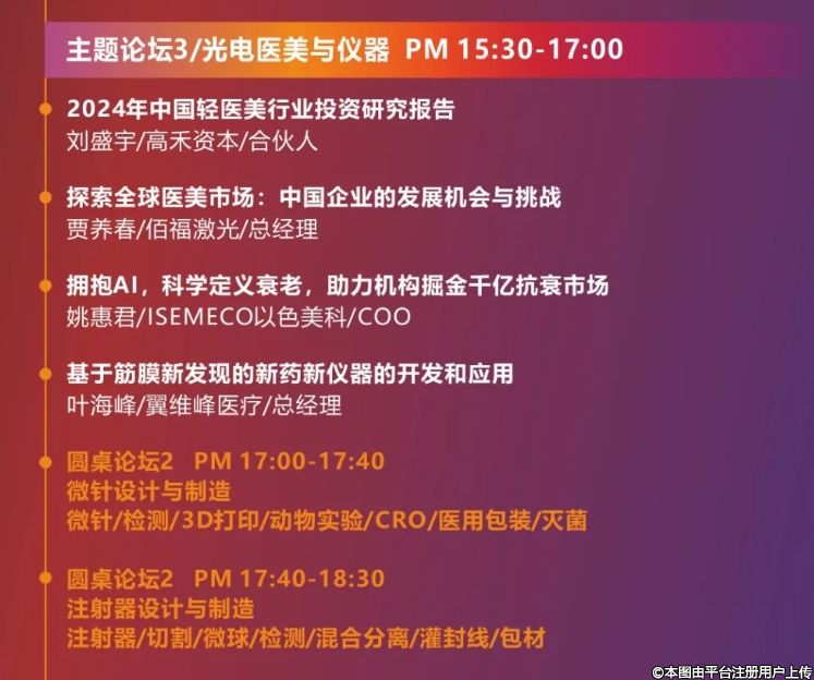 據(jù)悉,本次大會(huì)將從安全規(guī)范與市場(chǎng)準(zhǔn)入、注射醫(yī)美與應(yīng)用、光電醫(yī)美與儀器、多醫(yī)美融合與創(chuàng)新、項(xiàng)目路演與融資等六大領(lǐng)域開(kāi)展論壇,進(jìn)行深入研討與交流,加速國(guó)內(nèi)醫(yī)美生態(tài)圈建設(shè),全面、深度剖析、展望高端醫(yī)美器械的現(xiàn)狀與未來(lái),助力醫(yī)美賽道健康與穩(wěn)定發(fā)展。其中安全規(guī)范與市場(chǎng)準(zhǔn)入論壇將會(huì)邀請(qǐng)相關(guān)主管部門領(lǐng)導(dǎo)解析政策,同時(shí)圍繞安全、合規(guī)、注冊(cè)、動(dòng)物實(shí)驗(yàn)、檢測(cè)、準(zhǔn)入等層面進(jìn)行探討;注射醫(yī)美與應(yīng)用論壇則緊扣醫(yī)美材料、器械和醫(yī)美方案進(jìn)行研究;光電醫(yī)美與儀器論壇將深入探討光電醫(yī)美產(chǎn)業(yè)市場(chǎng)發(fā)展最新趨勢(shì)和機(jī)會(huì),并就微針和注射器的設(shè)計(jì)與制造全產(chǎn)業(yè)鏈展開(kāi)討論;多醫(yī)美融合與創(chuàng)新論壇將就多醫(yī)美與智能家居領(lǐng)域展開(kāi)分析與展望;而項(xiàng)目路演與融資將搭建醫(yī)美產(chǎn)業(yè)企業(yè)與投資機(jī)構(gòu)交流平臺(tái),促使資本與產(chǎn)業(yè)融合,助力醫(yī)美產(chǎn)業(yè)進(jìn)一步高速發(fā)展,目前佰福激光、呈諾醫(yī)學(xué)、翼維峰醫(yī)療、繡麗醫(yī)藥、新世元生物、藍(lán)皓生物等超過(guò)10家企業(yè)已報(bào)名參與。