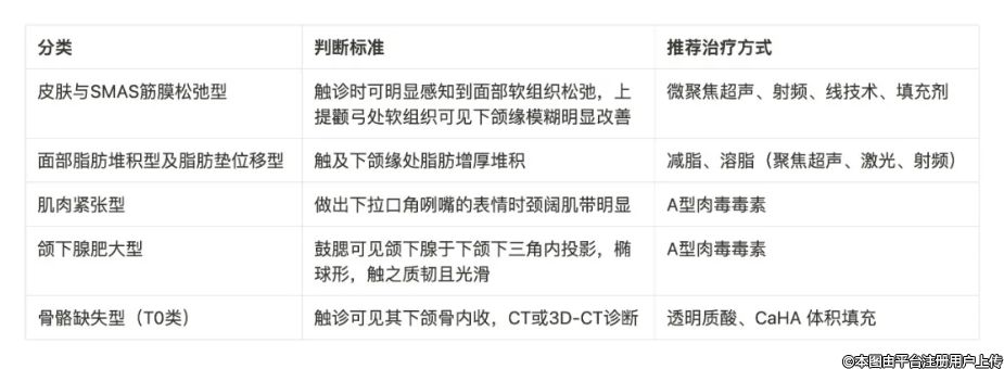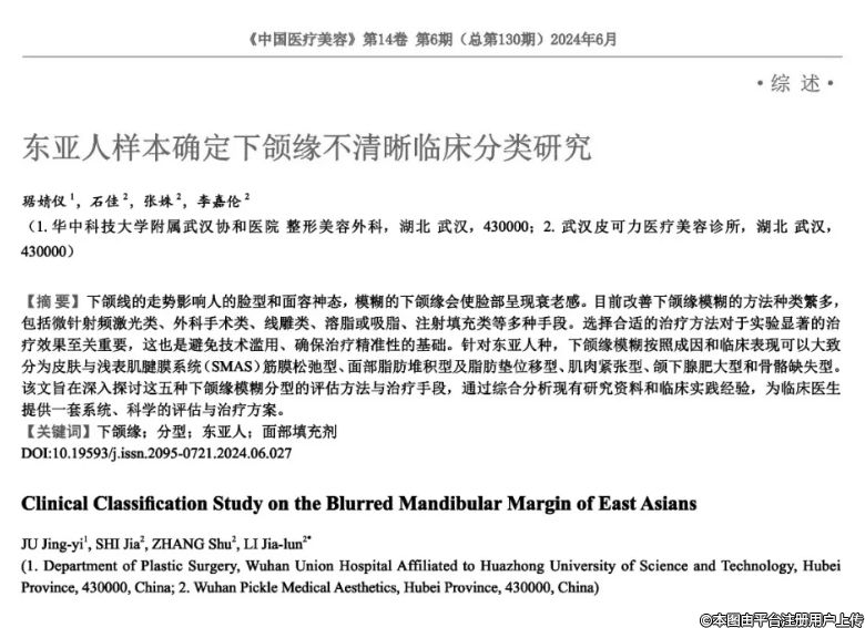 摘要:下頜線的走勢(shì)影響人的臉型和面容神態(tài),模糊的下頜緣會(huì)使臉部呈現(xiàn)衰老感。目前改善下頜緣模糊的方法種類繁多,包括微針射頻激光“類、外科手術(shù)類、線雕類、溶脂或吸脂、注射填充類等多種手段。選擇合適的治療方法對(duì)于實(shí)驗(yàn)顯著的治療效果至關(guān)重要,這也是避免技術(shù)濫用、確保治療精準(zhǔn)性的基礎(chǔ)。針對(duì)東亞人種,下頜緣模糊按照成因和臨床表現(xiàn)可以大致分為皮膚與淺表肌腱膜系統(tǒng)(SMAS)筋膜松弛型、面部脂肪堆積型及脂肪墊位移型、肌肉緊張型、頜下腺肥大型和骨骼缺失型。該文旨在深入探討這五種下頜緣模糊分型的評(píng)估方法與治療手段,通過(guò)綜合分析現(xiàn)有研究資料和臨床實(shí)踐經(jīng)驗(yàn),為臨床醫(yī)生提供一套系統(tǒng)、科學(xué)的評(píng)估與治療方案。