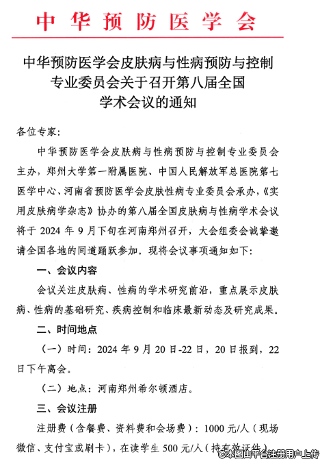 中華預(yù)防醫(yī)學(xué)會(huì)皮膚病與性病預(yù)防與控制專業(yè)委員會(huì)關(guān)于召開第八屆全國學(xué)術(shù)會(huì)議的通知