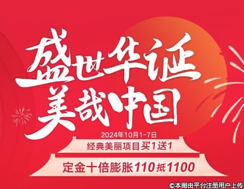 盛世華誕,美哉中國,烏魯木齊華美給大家送美容福利啦,在國慶期間,經(jīng)典美麗項(xiàng)目買一送一,定金十倍膨脹,110元抵1100元,超值福利,大家還在等什么呢?