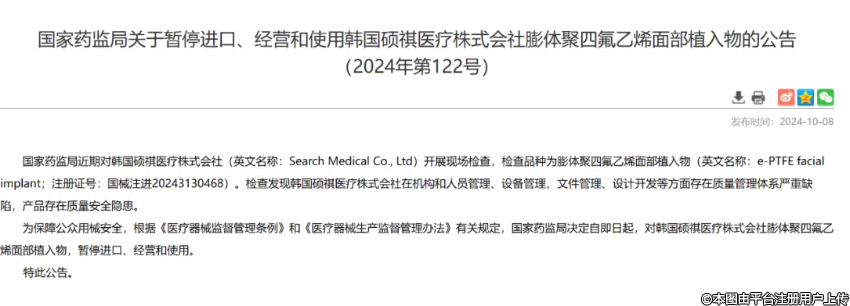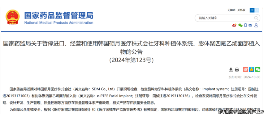 10月8日,國家藥監(jiān)局官網(wǎng)接連發(fā)布了兩個公告:《國家藥監(jiān)局關(guān)于暫停進(jìn)口、經(jīng)營和使用韓國碩祺醫(yī)療株式會社膨體聚四氟乙烯面部植入物的公告(2024年第122號)》、《國家藥監(jiān)局關(guān)于暫停進(jìn)口、經(jīng)營和使用韓國碩月醫(yī)療株式會社牙科種植體系統(tǒng)、膨體聚四氟乙烯面部植入物的公告(2024年第123號)》。