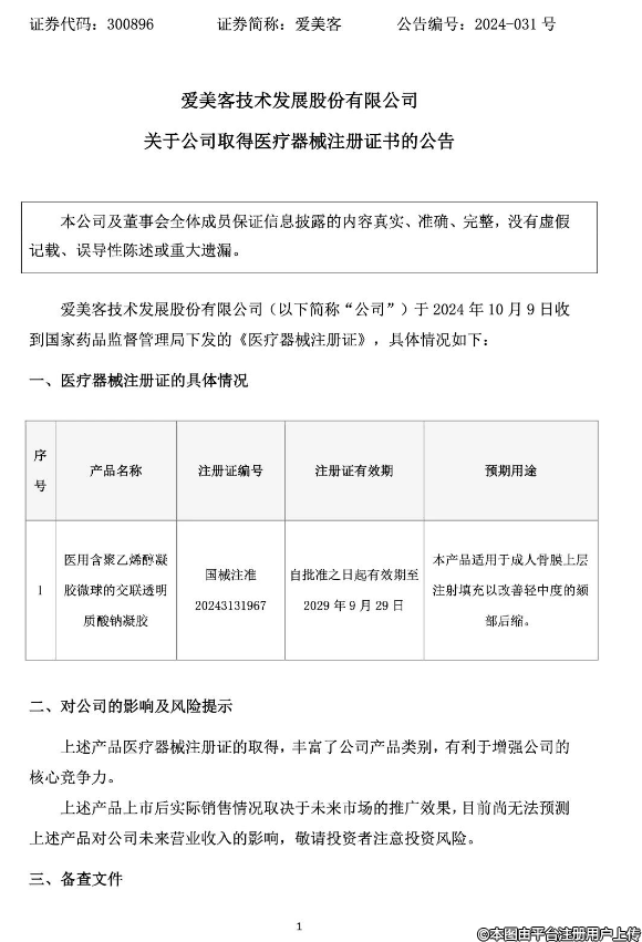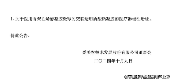 愛美客10月9日晚間發(fā)布公告稱,愛美客技術(shù)發(fā)展股份有限公司于2024年10月9日收到國家藥品監(jiān)督管理局下發(fā)的《醫(yī)療器械注冊證》。產(chǎn)品名稱為“醫(yī)用含聚乙烯醇凝膠微球的交聯(lián)透明質(zhì)酸鈉凝膠”。