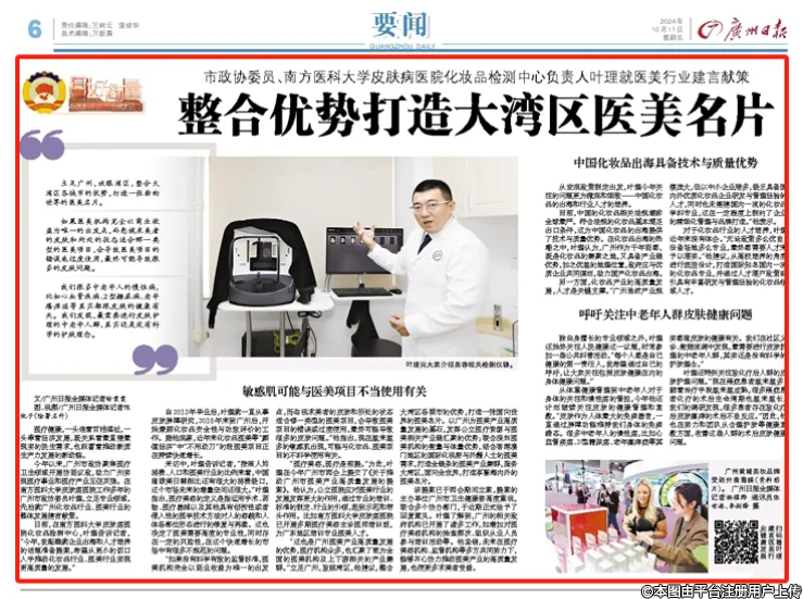 10月11日,廣州日?qǐng)?bào)刊登《整合優(yōu)勢(shì)打造大灣區(qū)醫(yī)美名片》一文,專訪廣州市政協(xié)委員、南方醫(yī)科大學(xué)皮膚病醫(yī)院化妝品檢測中心負(fù)責(zé)人葉理就醫(yī)美行業(yè)建言獻(xiàn)策?,F(xiàn)轉(zhuǎn)載全文報(bào)道,以饗讀者。