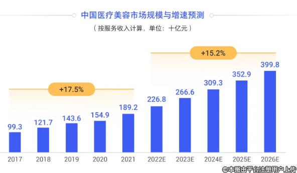 數(shù)據(jù)顯示,中國(guó)醫(yī)療美容市場(chǎng)自2017年起,以每年17.5%的符合增長(zhǎng)率增長(zhǎng)至2021年的近1,900億規(guī)模,而從2022年起,預(yù)計(jì)后續(xù)增長(zhǎng)稍有放緩,以每年15.2%的復(fù)合增長(zhǎng)率持續(xù)增長(zhǎng),呈現(xiàn)預(yù)計(jì)2023年全年市場(chǎng)規(guī)模將達(dá)2,666億元,預(yù)計(jì)2026年整個(gè)醫(yī)美市場(chǎng)將達(dá)到近4,000億的市場(chǎng)規(guī)模。