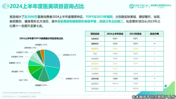 據(jù)2024上半年度醫(yī)美項(xiàng)目咨詢占比情況,在對(duì)近3000萬(wàn)醫(yī)美消費(fèi)者進(jìn)行統(tǒng)計(jì)后發(fā)現(xiàn),“皮膚美容”已連續(xù)3年占據(jù)搜索榜單第一名。