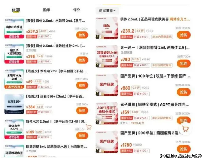 于是,醫(yī)美下游的價(jià)格戰(zhàn)愈演愈烈。在團(tuán)購(gòu)平臺(tái)上,從幾百元的水光針、到千元超聲炮,甚至還出現(xiàn)了9.9元的組合打包價(jià)。