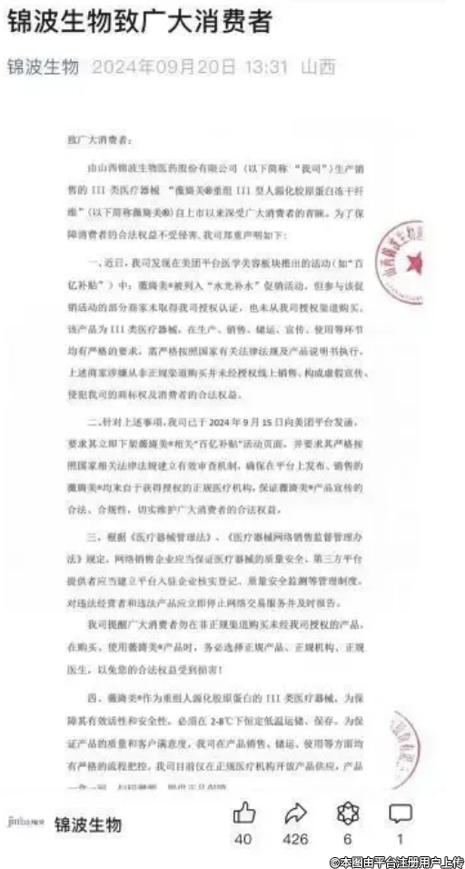 國(guó)慶節(jié)前,山西錦波生物發(fā)文嗆聲美團(tuán),稱“美團(tuán)平臺(tái)醫(yī)學(xué)美容板塊推出的‘百億補(bǔ)貼’活動(dòng)中薇旖美被列入‘水光補(bǔ)水’促銷活動(dòng),但參與該促銷活動(dòng)的部分商家未取得我司授權(quán)認(rèn)證,也未從我司授權(quán)渠道購(gòu)買。”