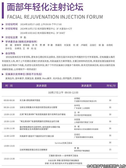 2024年10月16-18日,問(wèn)美東方整合年輕化大會(huì)將在杭州國(guó)際博覽中心舉辦。本次大會(huì)由問(wèn)美時(shí)代科技文化有限公司主辦,由杭州友麗醫(yī)療美容集團(tuán)承辦,由中國(guó)整合年輕化學(xué)會(huì)(香港)、WRG祛斑抗衰聯(lián)盟、杭州連天美醫(yī)療美容醫(yī)院、杭州維多利亞醫(yī)療美容醫(yī)院、杭州時(shí)光醫(yī)療美容醫(yī)院、杭州米蘭柏羽醫(yī)療美容醫(yī)院、維莎(浙江)醫(yī)療科技有限公司、杭州美娜多文化科技有限公司協(xié)辦。