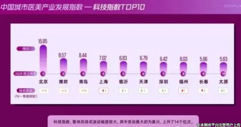 在 50 座城市中,嘉興由上期的 48 位上升到本期的 34 位,變動幅度最大。北京作為全國科技創(chuàng)新中心,在醫(yī)美科技領(lǐng)域始終保持領(lǐng)先地位。各城市應(yīng)加大對醫(yī)美科技的研發(fā)投入,提升自主創(chuàng)新能力,推動醫(yī)美產(chǎn)業(yè)向高端化、智能化方向發(fā)展。
