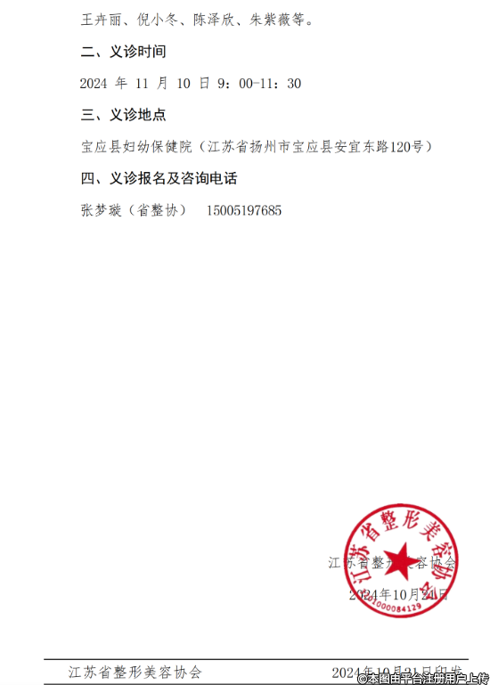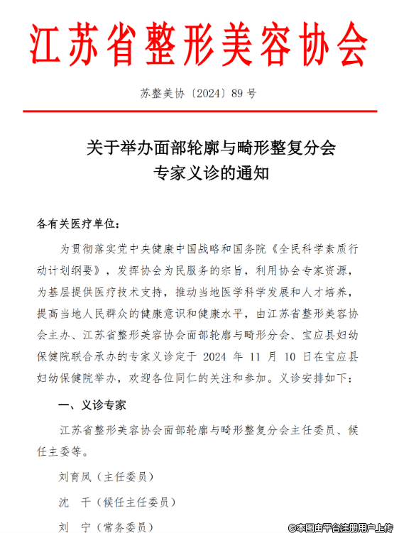 為貫徹落實黨中央健康中國戰(zhàn)略和國務(wù)院《全民科學(xué)素質(zhì)行動計劃綱要》,發(fā)揮協(xié)會為民服務(wù)的宗旨,利用協(xié)會專家資源為基層提供醫(yī)療技術(shù)支持,推動當?shù)蒯t(yī)學(xué)科學(xué)發(fā)展和人才培養(yǎng),提高當?shù)厝嗣袢罕姷慕】狄庾R和健康水平,由江蘇省整形美容協(xié)會主辦、江蘇省整形美容協(xié)會面部輪廓與畸形分會、寶應(yīng)縣婦幼保健院聯(lián)合承辦的專家義診定于2024年11月10 日在寶應(yīng)縣婦幼保健院舉辦,歡迎各位同仁的關(guān)注和參加。義診安排如下: