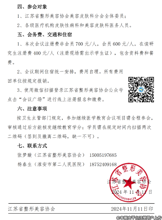 為提升江蘇省整形美容協(xié)會(huì)美容皮膚科分會(huì)的引領(lǐng)作用,推動(dòng)我省皮膚美容事業(yè)的發(fā)展,經(jīng)協(xié)會(huì)研究,由江蘇省整形美容協(xié)會(huì)主辦、淮安市第二人民醫(yī)院承辦的 2024 年皮膚外科和皮膚美容學(xué)習(xí)班(項(xiàng)目編號(hào):20240712000010)定于12月7-8日在淮安市召開?,F(xiàn)將會(huì)議有關(guān)事宜通知如下: